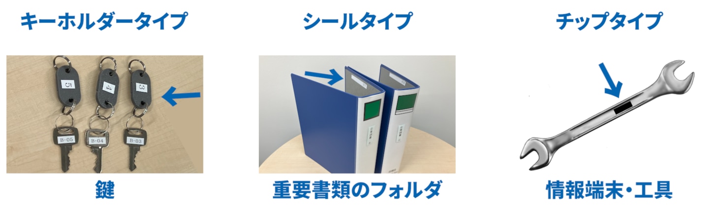 管理対象物の形状などにあわせたRFIDタグ(キーホルダータイプ、シールタイプ、チップタイプなど)を使い分けることで、鍵や重要書類のフォルダ、情報端末、工具など、幅広い備品の管理が可能です。