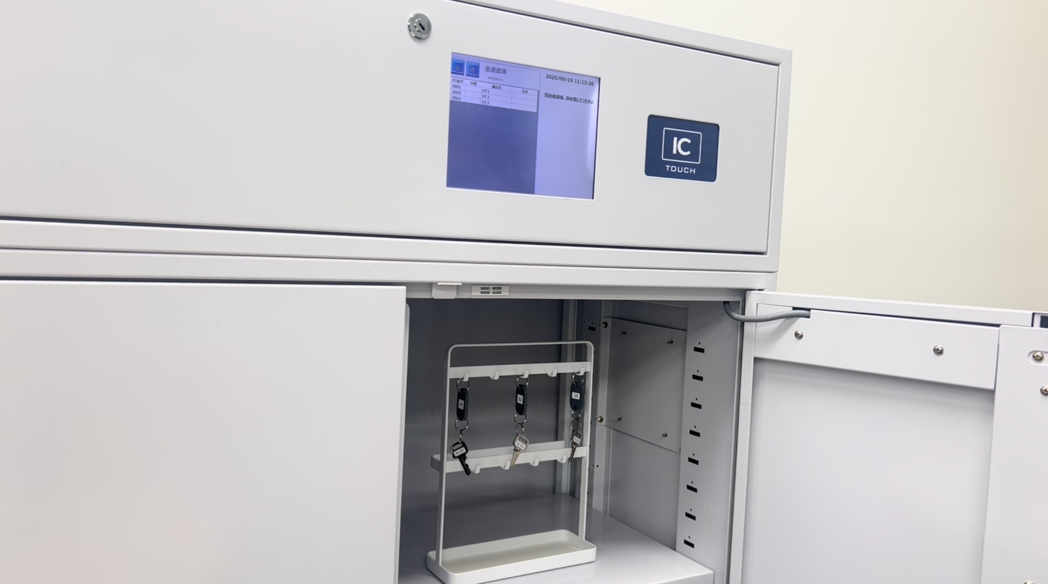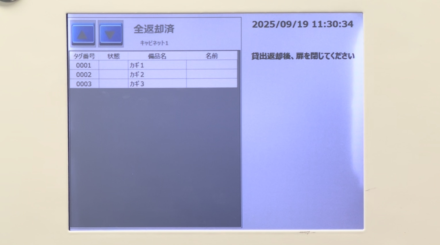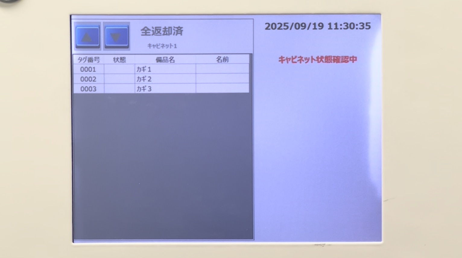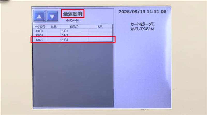 安心キャビネット®に取り付けられている画面には、備品が全て揃っている状態を示す「全返却済」と表示されており、「カギ1」「カギ2」「カギ3」と3つのRFIDタグの情報が表示されています。