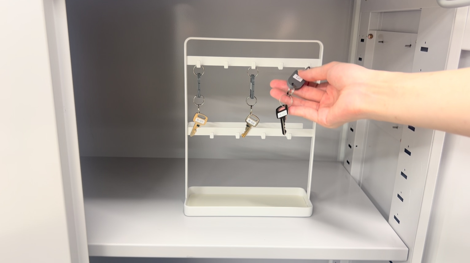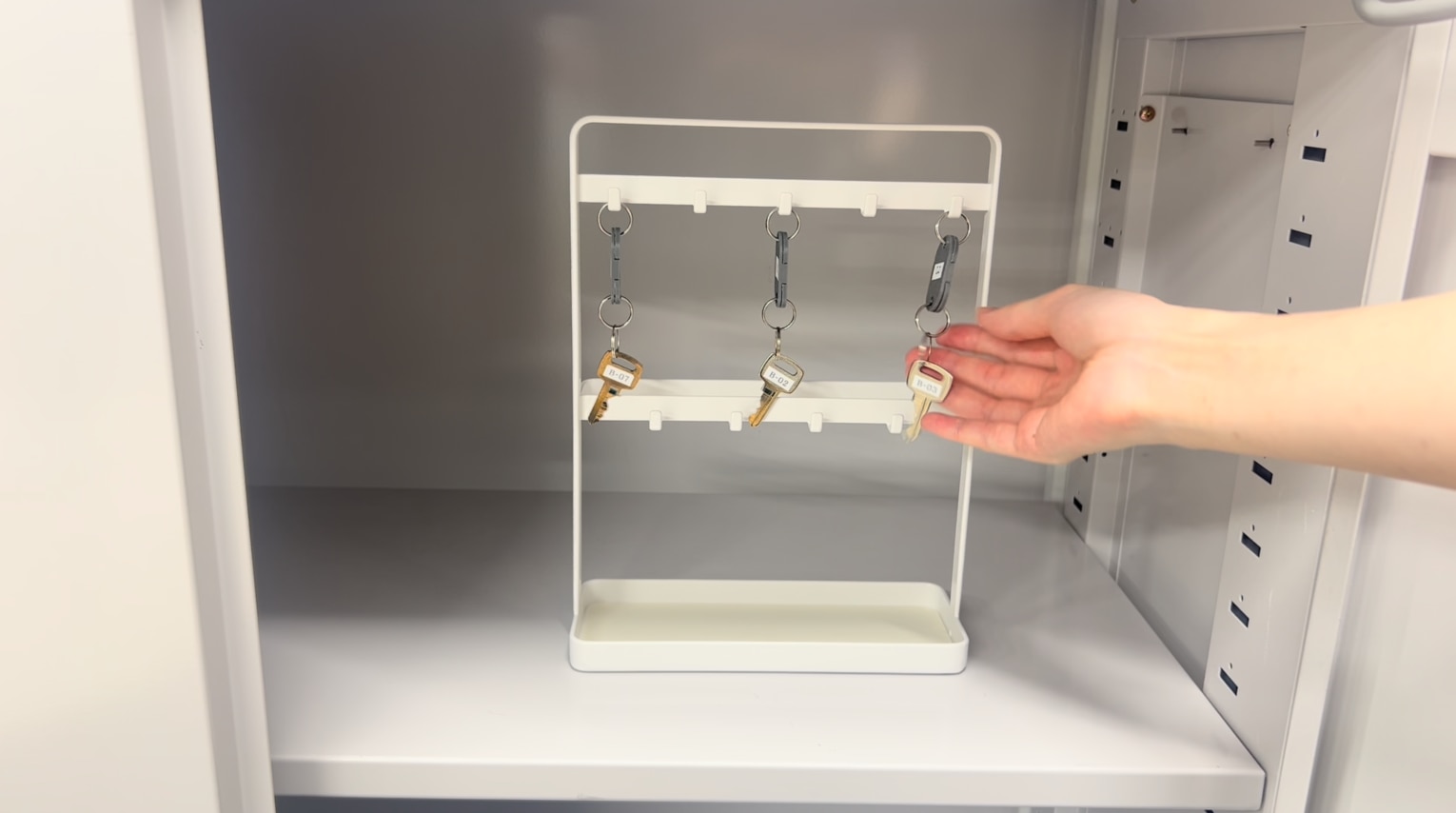 RFIDタグが付いている備品(今回はカギ3)をキャビネット内に戻し、扉を閉めます。