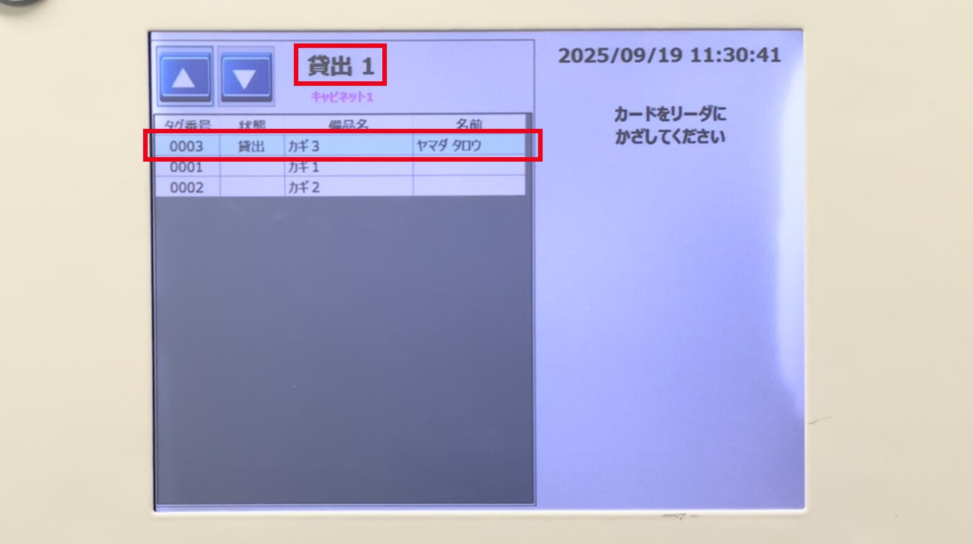 数秒待つとスキャンが完了し、取り出された「カギ3」の行が青く表示され、ステータスが「貸出」に変わりました。