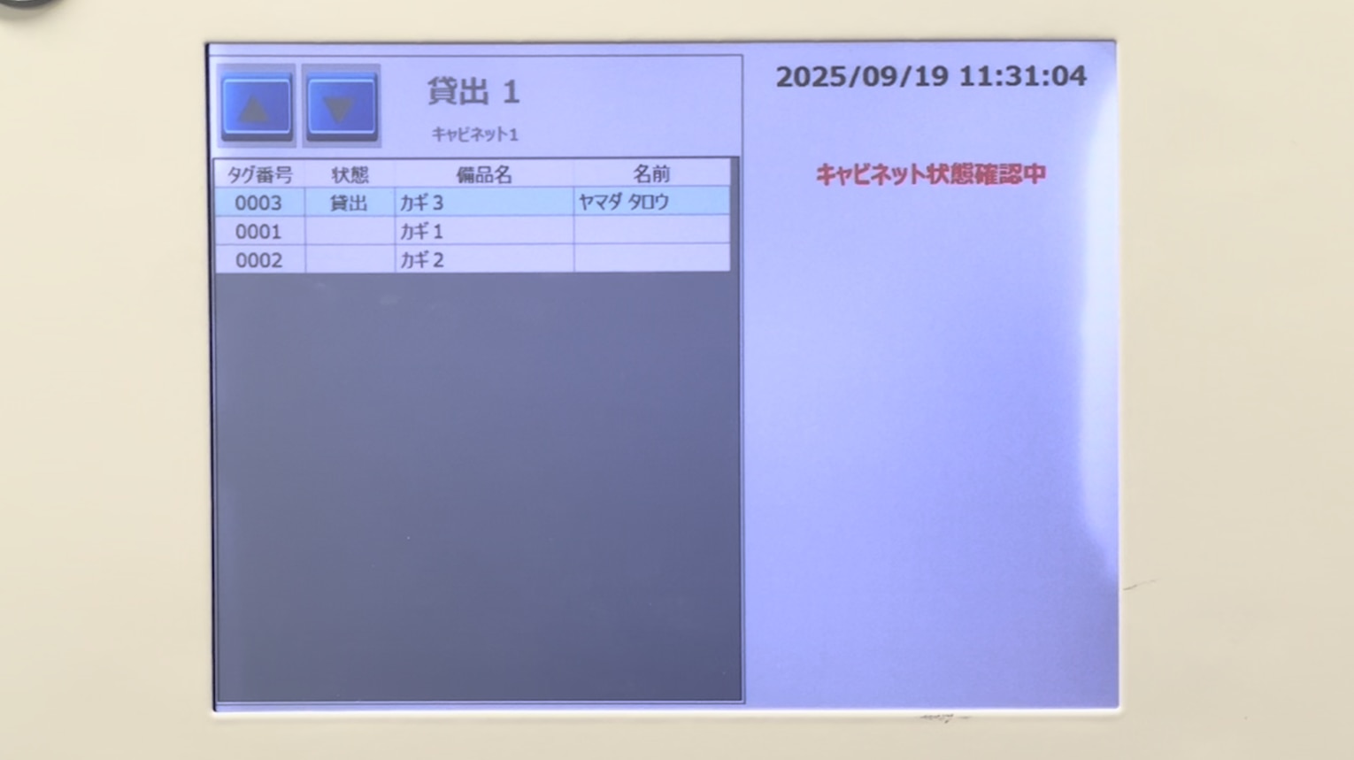 右列には「ヤマダ タロウ」と表示されており、「開錠を行った人」=「持ち出した人」が一目でわかるようになっています。また、現在貸し出し中の物品が1点あるため、上部の表示が「貸出 1」に変わりました。