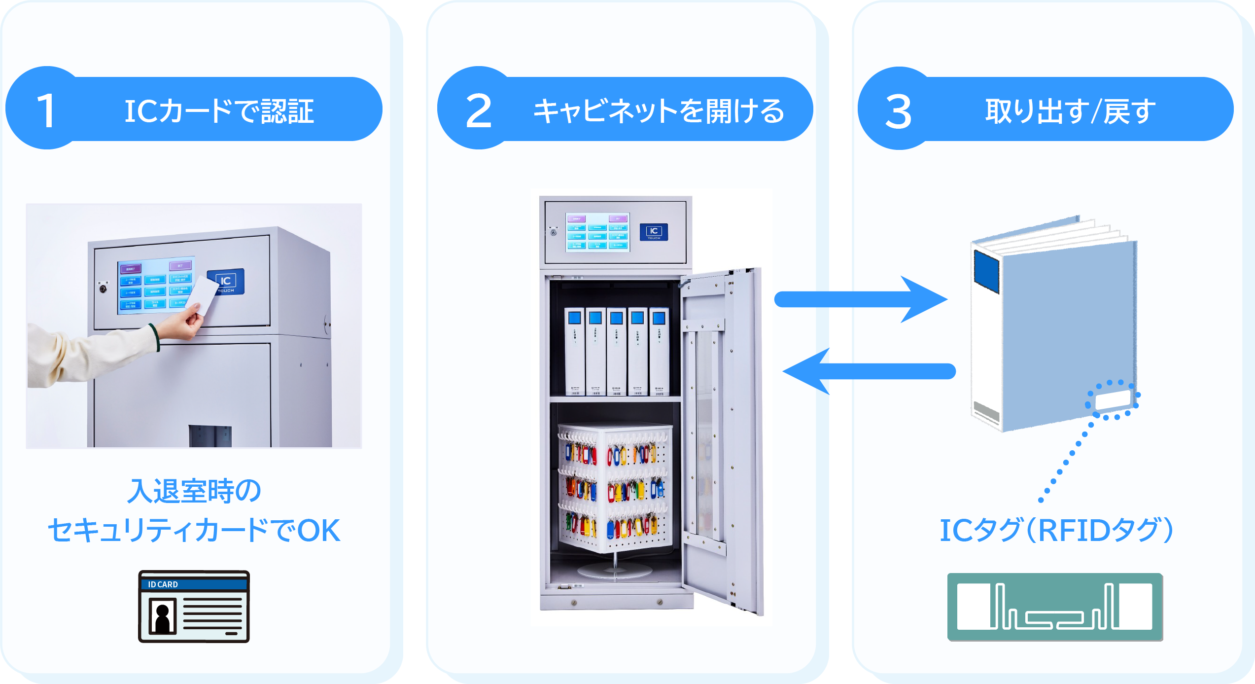 安心キャビネット®は、入退室時に使用するセキュリティカードなどのICカードで認証を行います。