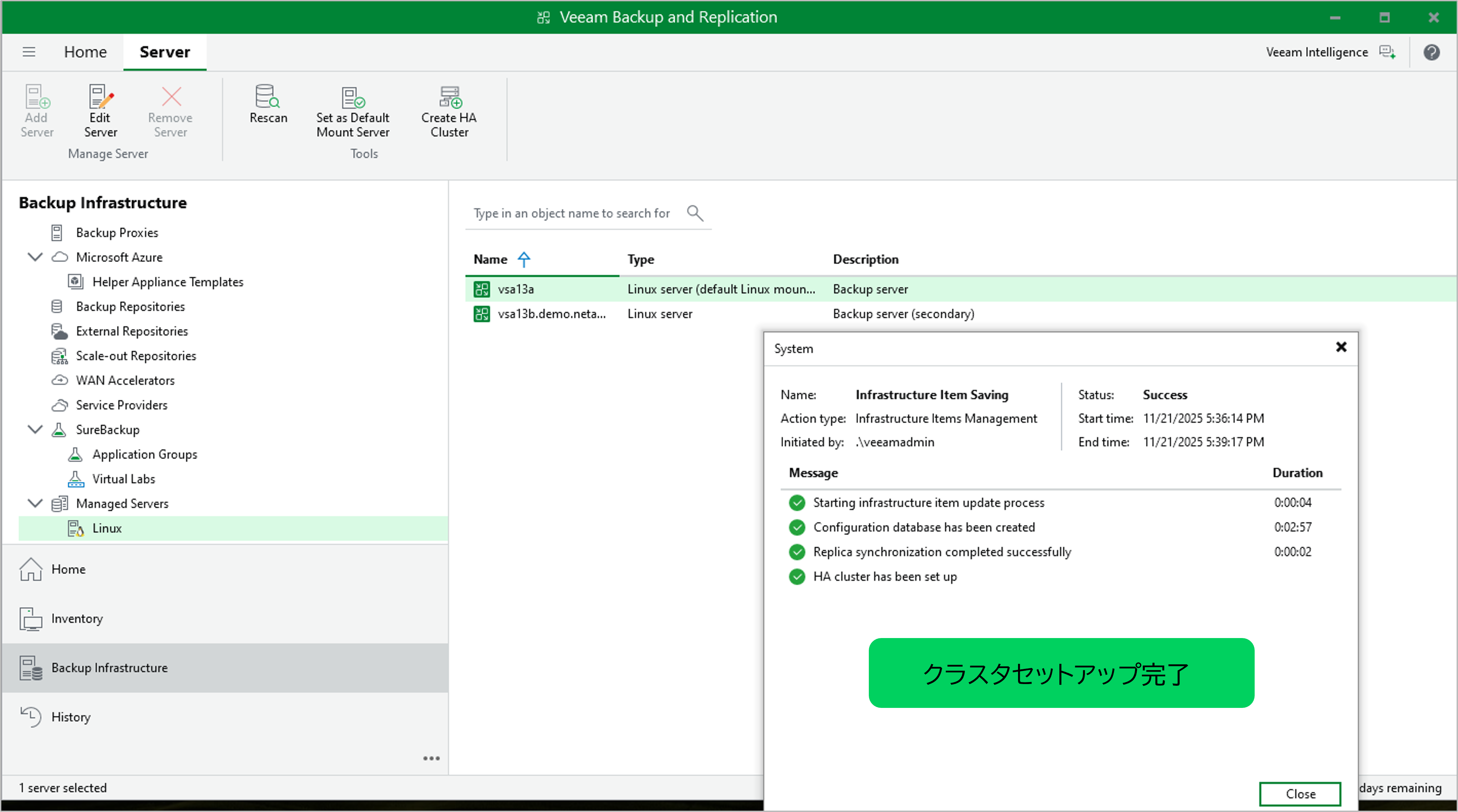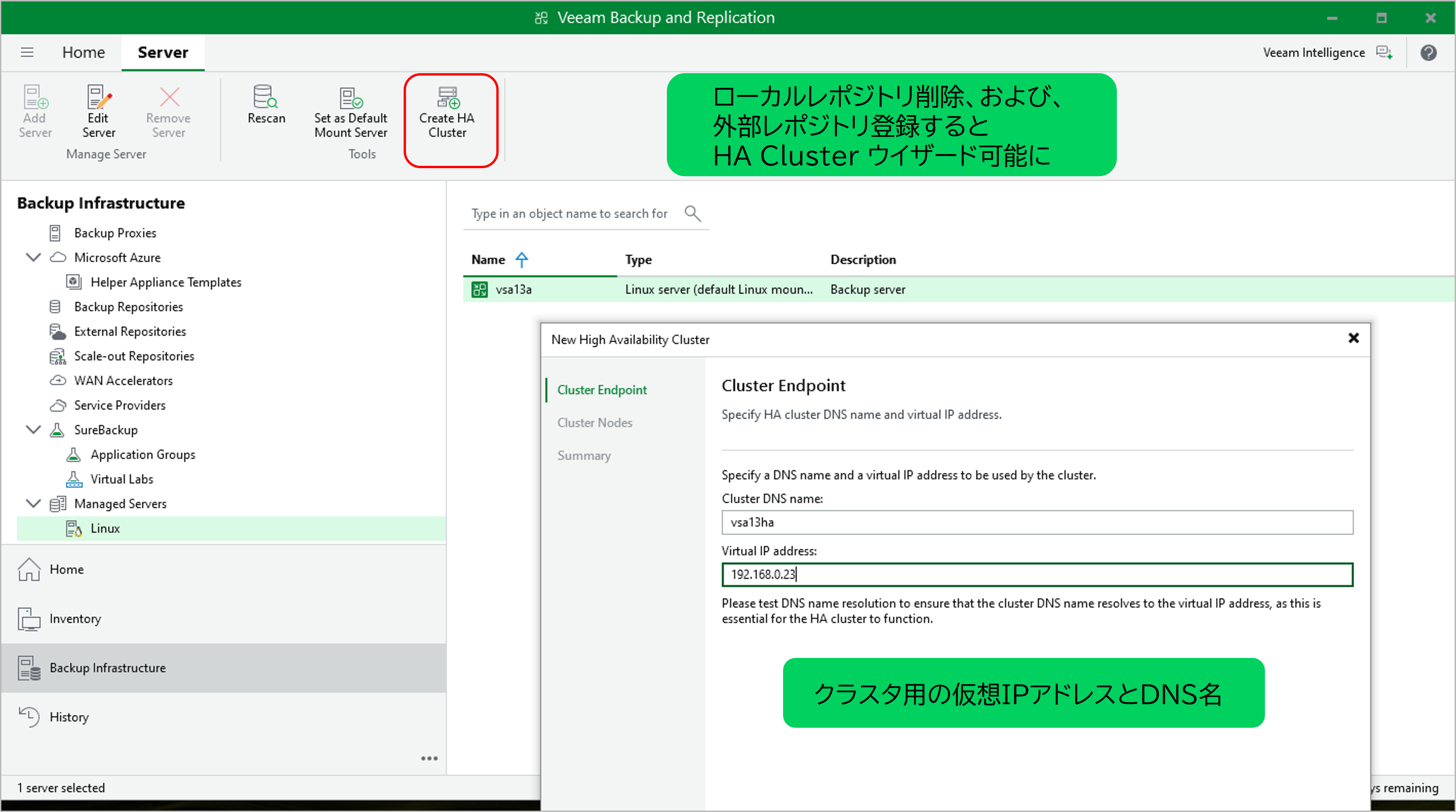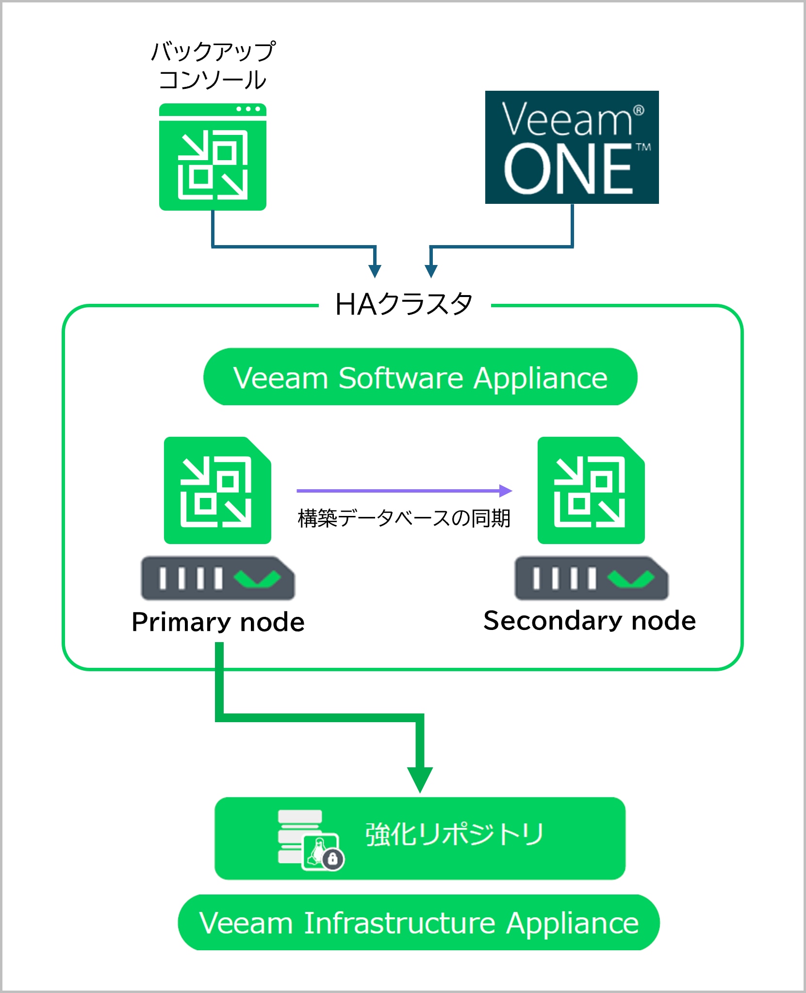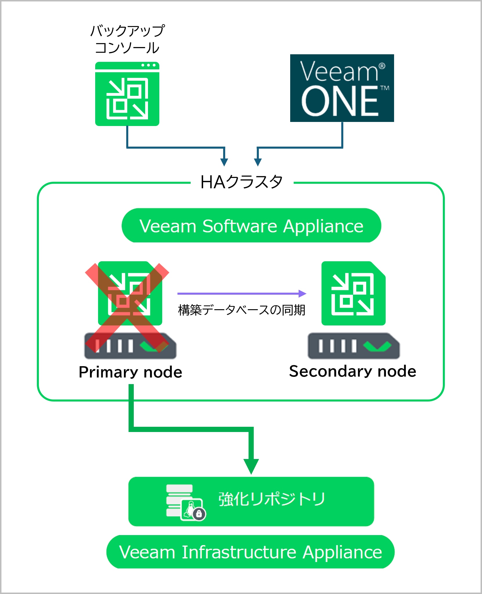 Veeam v13 の Software Appliance(Linuxベース)では、2台のノードを使用してアクティブ・スタンバイのHAクラスタを構成できます。