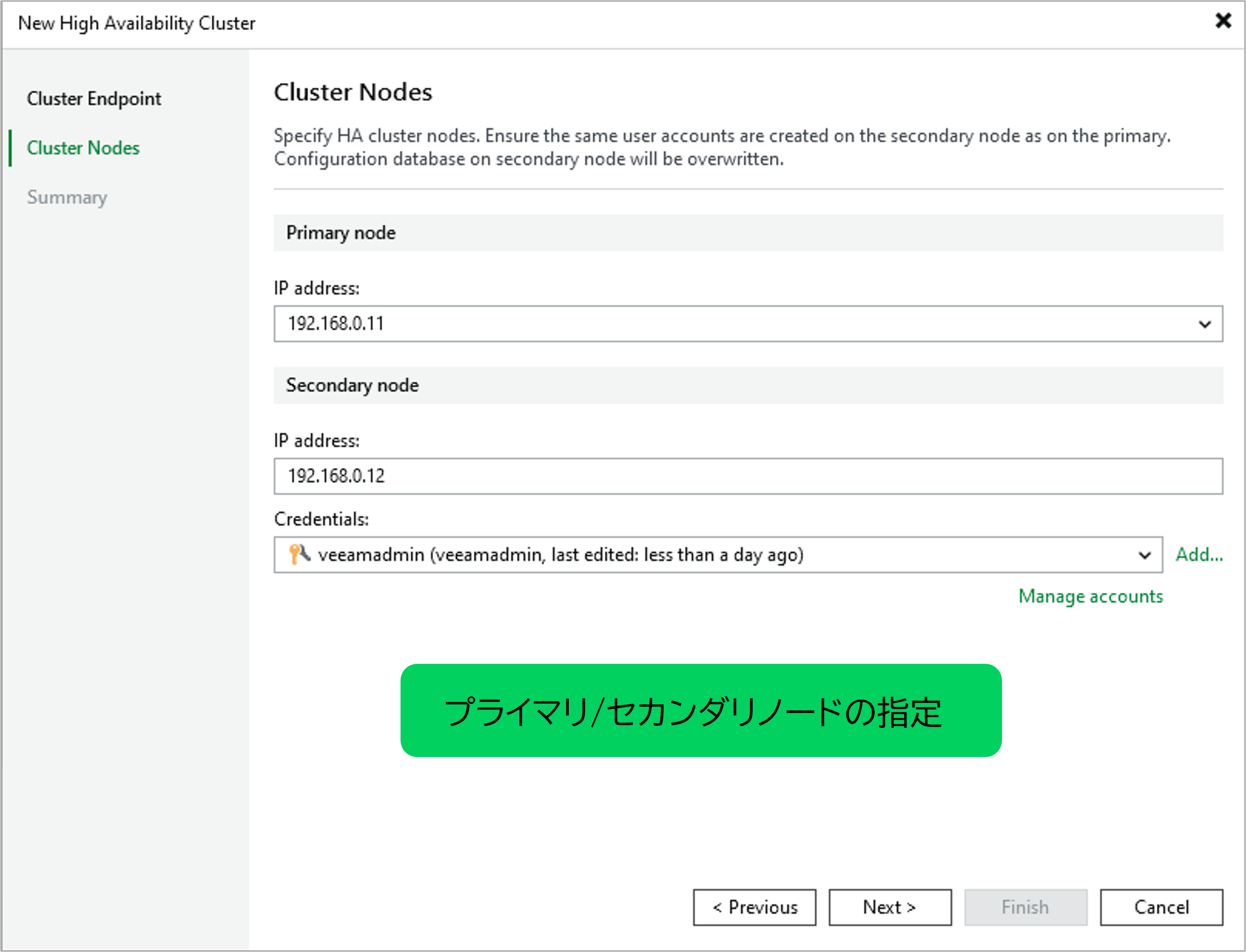 図:HAクラスタ作成ウィザード(プライマリ/セカンダリノードの指定)