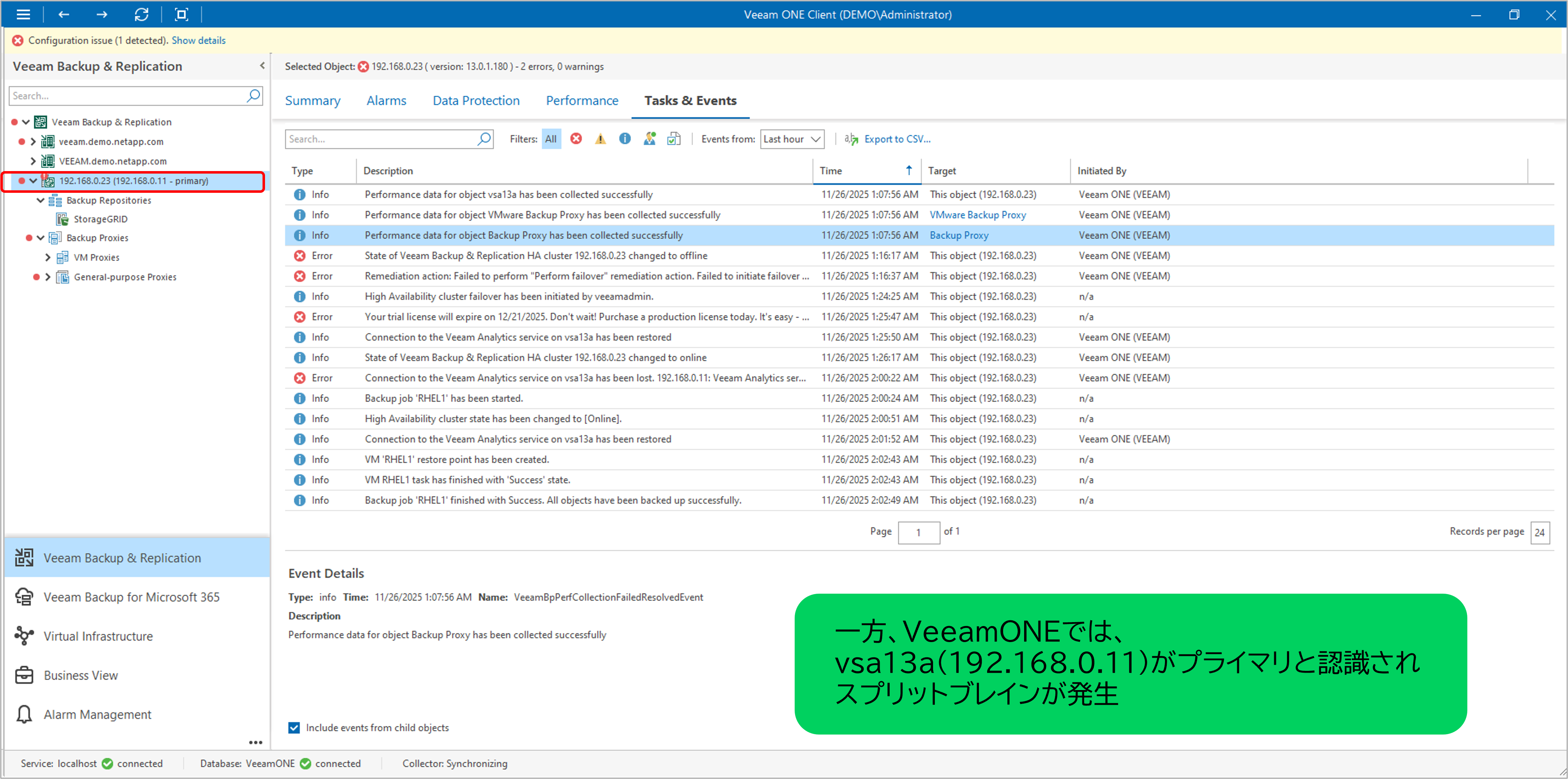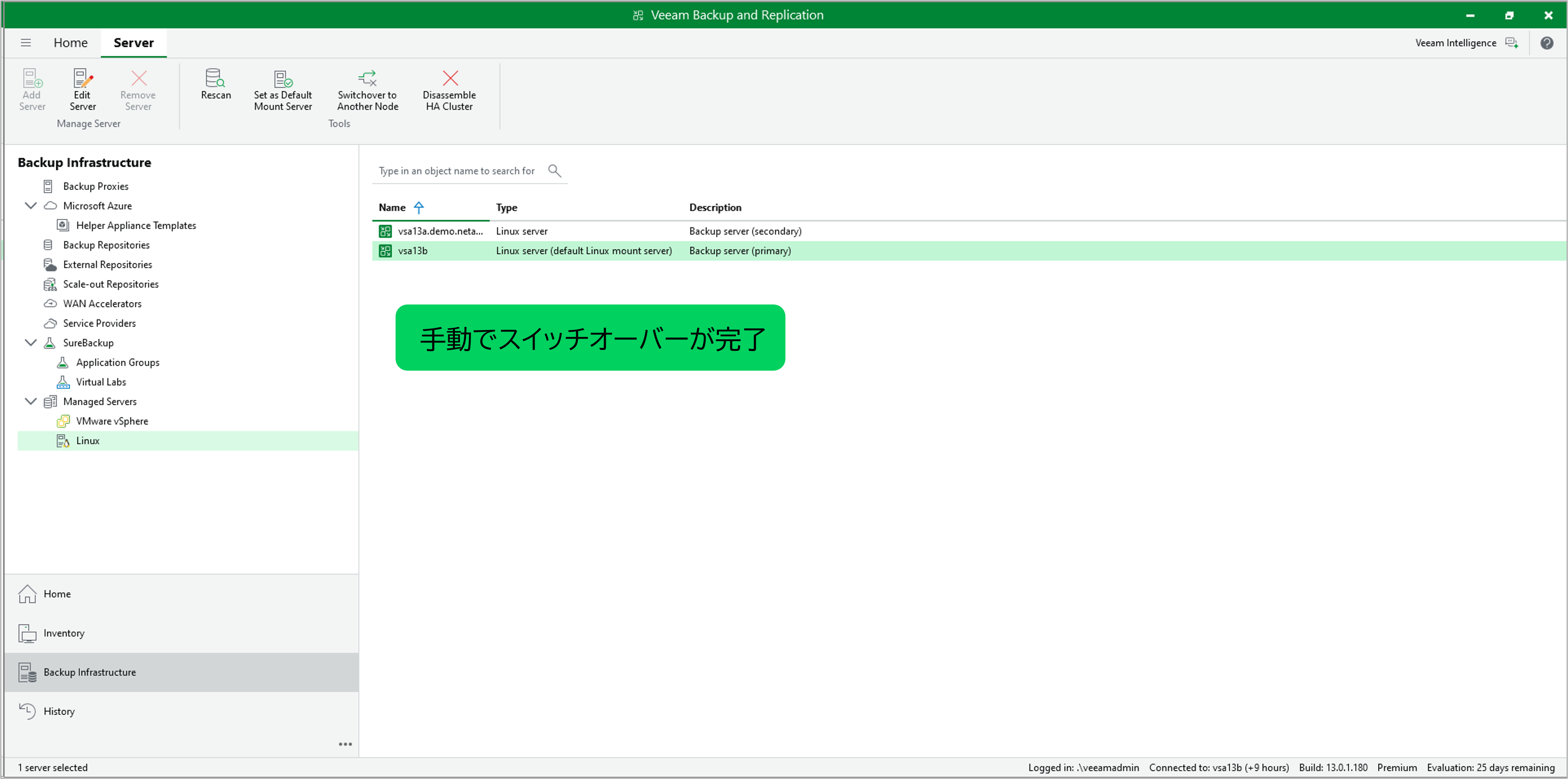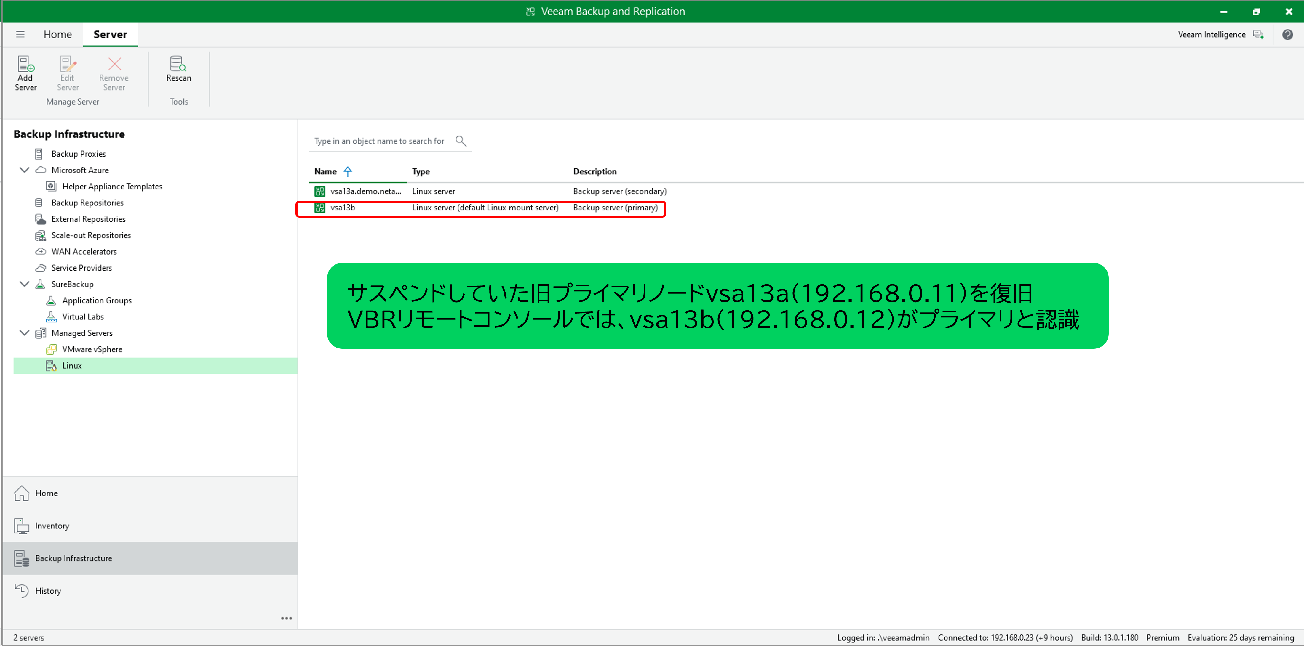 - Veeam ONE : vsa13a(旧プライマリ)がプライマリと認識