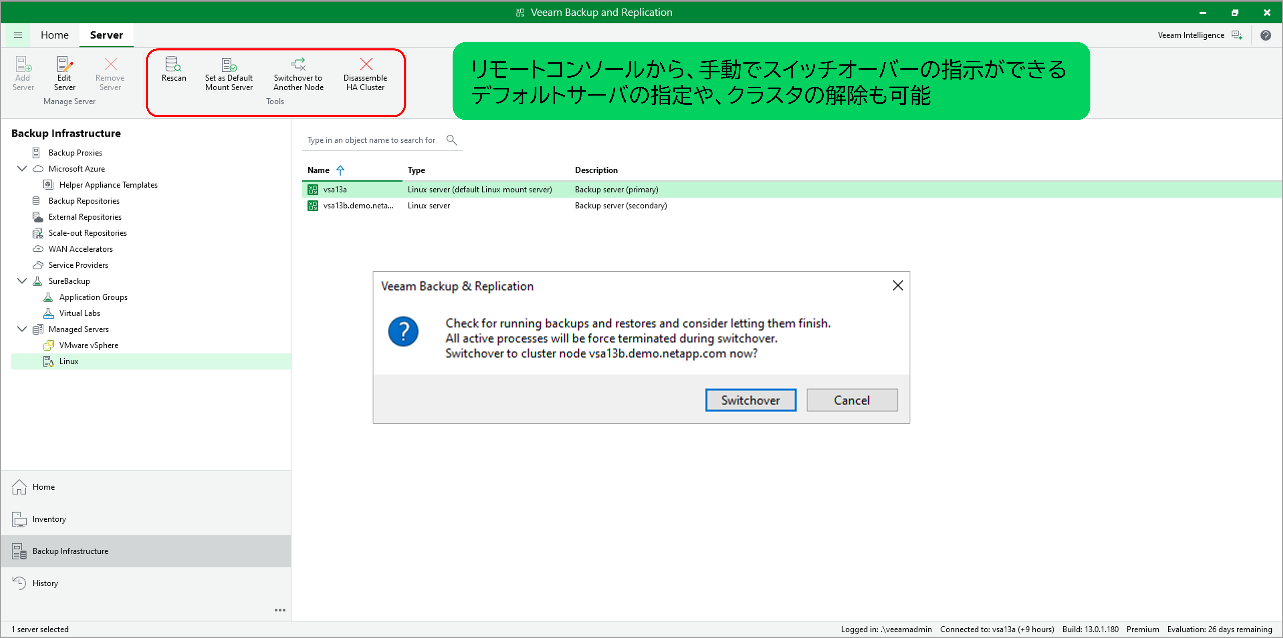 v13.0.1以降、Veeam ONEを「Witness(監視役)」として使用することで、プライマリノードに障害が発生した際、自動的にセカンダリへ切り替えることが可能になりました 。