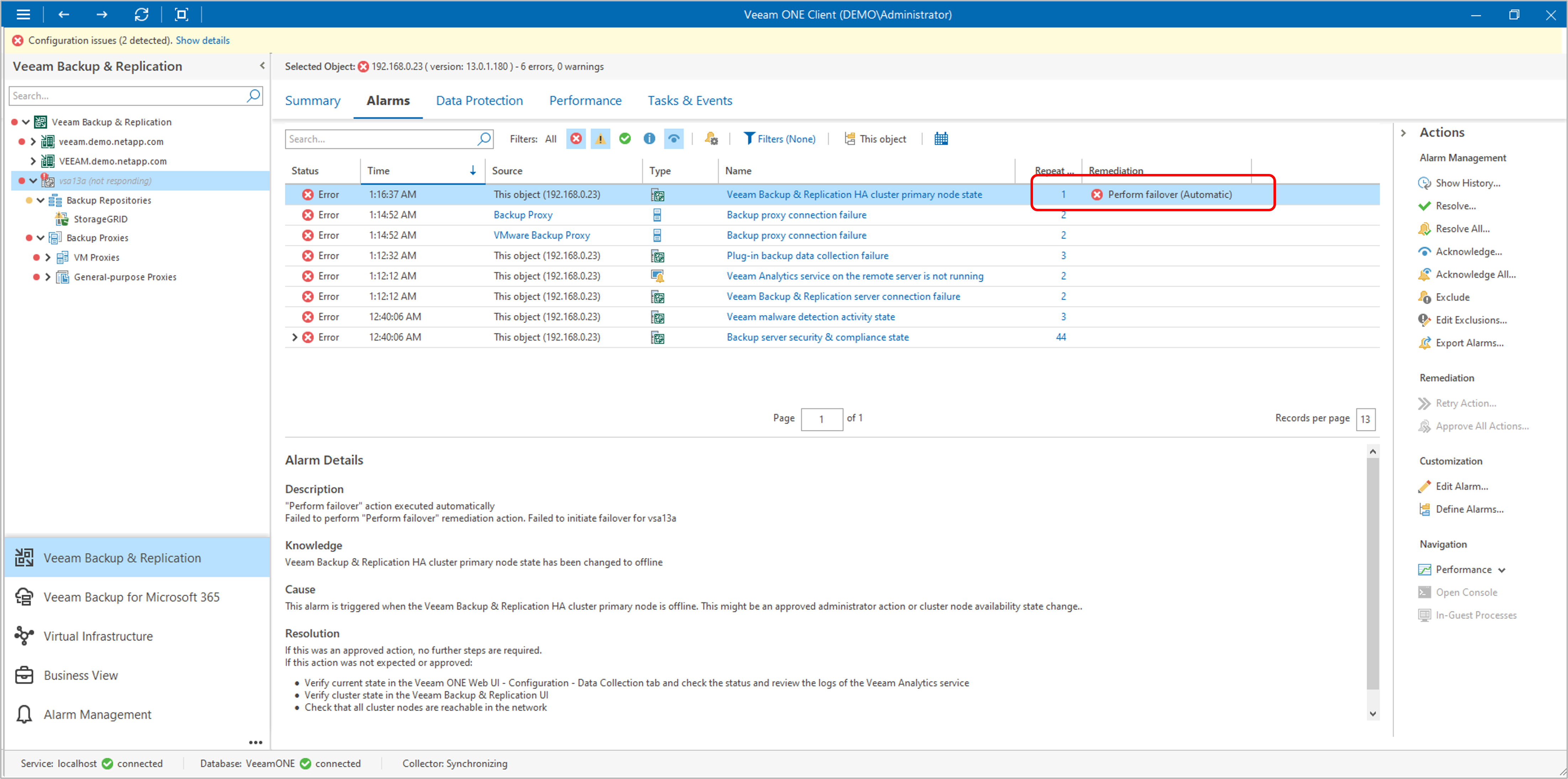 自動フェイルオーバーを作動させるには、Veeam ONEのアラーム定義で「Remediation Action(修復アクション)」を設定する必要があります。